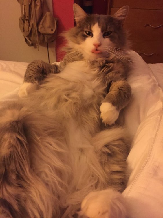 My cat Sam (7 yrs old) and previous pupper Sparky (he passed a few years ago at 13, such a good boi). Sam actually isn't a chonker he's just a mix of Norwegian forest cat and Maine Coon so he gets a SUPER fluffy coat and I'm the only one who gets to hold him like a baby haha.