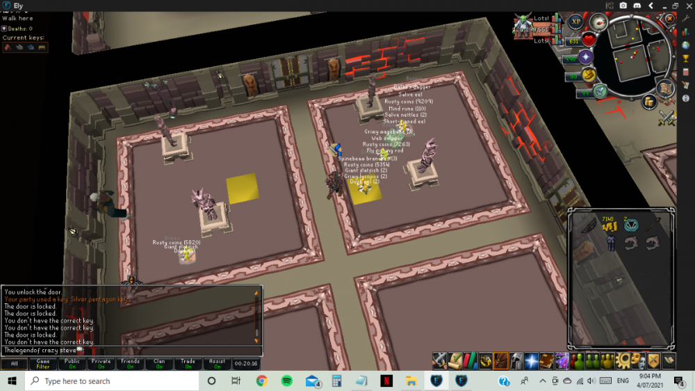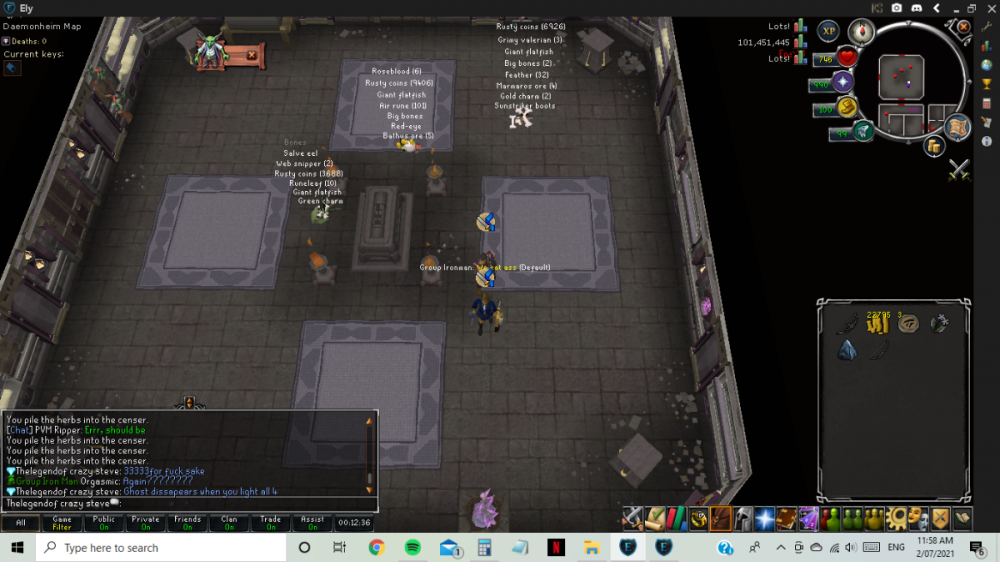 Dungeoneering; 1. there is the puzzle room where the 2 southern sets of statues must match the top 2 sets. Walking and manoeuvring around these statues is annoying asf because you cant simply click on the opposite side of the statue as it is bugged. only a little inconvenience but a fix would be nice. 2. The room with the ghost, a ring, tomb and the 4 burners that must be lit with 4 herbs. twice in a row when doing this room, once all 4 burners are lit, the ghost disappears and you cannot finish the room, and if this is early in a dung you miss out on doors that you probably need. i have had to quit a few dgs because of this 3. Walking through doors/guardian doors sometimes makes you backstep instead of going through, making you have to click on the door again. 4. walking through doors/guardian doors and getting stuck in the wall Regular gameplay bugs 1. A couple times now withdrawing money from my pouch has made it dissapear. I cant remember all the details but the first time i withdrew 2100m from my pouch and had something around a few mill in my inv, withdrew and it left me 1 gp in my pouch and 1 gp in my inv. The last time it happened i withdraw a max scroll, i had 1 spare inv place, enough for the scroll but the scroll dissapeared and was left with the loose change. 2. Nex is still dropping un-noted drops such as grimy torstals, gems and more. This is all i can remember for now team